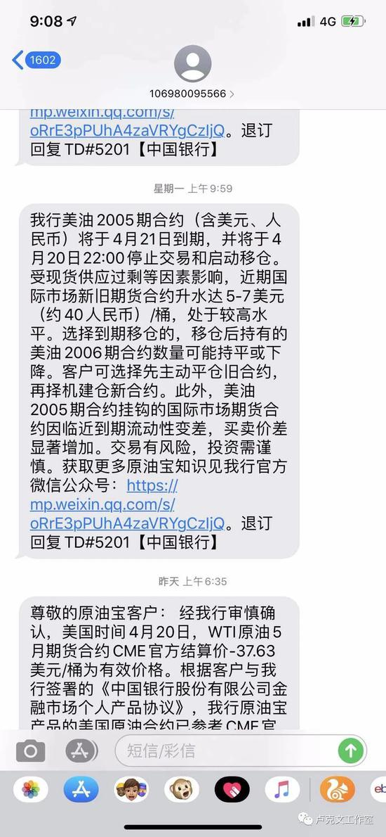 老苏认为,这件事原油宝有不可推卸的责任的,他们是非常信任银行的,21号当天晚上他们也发了一个短信给老苏,说10点要换仓了,老苏还对他老婆说,多亏这10点钟换仓,要不跌到下半夜跌到负值时,这钱一分钱都没有了,自己还要倒贴钱,当时还觉得挺幸运的,原油宝算得蛮准,结果4月21号全部都停了,没有动作了,22号就通知他们已经巨额亏损。