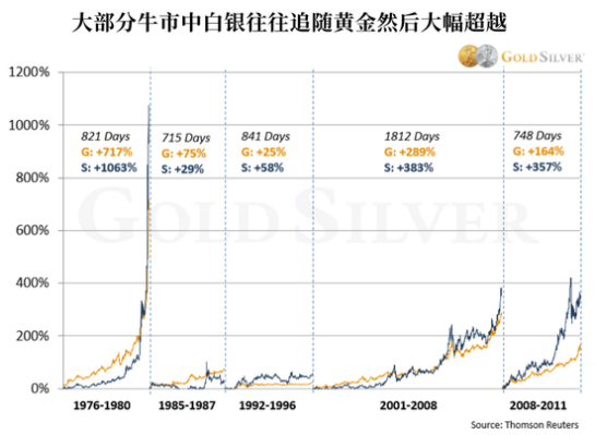 放眼望去国内能够投资白银现货的渠道似乎只有纸白银,但美股市场上实际上有多只挂钩白银现货的基金,其中最具代表性的就是全球规模最大的白银ETF-iShares Silver Trust(简称SLV), SLV的持仓规模变化对白银的走势也有一定的指示作用。新浪财经后续也会推出SLV持仓规模的变化图表,敬请投资者关注。SLV挂钩的是伦敦金银市场协会LMBA符合交割规定的银锭。有美股账户的投资者可以考虑适当关注。目前SLV白银持仓已经连续多日增持超过200吨,反映了市场对白银后市上涨的积极预期。历史数据也显示,大部分贵金属牛市中白银往往追随黄金然后大幅超越。