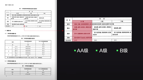 我们以商务部的标准为例,这套标准分为AA级、A级、或者B级。一个鸡蛋想要被评为AA级,在蛋壳、蛋白、蛋黄、异物、哈夫单位等方面都有详细的要求。