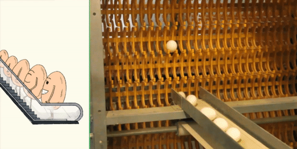 首先,鸡蛋会沿着蛋槽或者乘坐自动升降电梯来到中央传送带。传送带的末端是鸡蛋收集系统,这个系统,会将东倒西歪的鸡蛋排队整理送去清洗,洗去蛋壳表面的鸡屎。