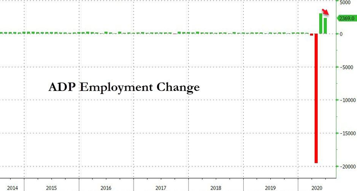 周三公布的美国6月ADP就业人数录得增加236.9万人,高于预期的300万人,前值从-276万上修至306.5万,增幅高达582.5万人。就业报告显示,贸易业、制造业、建筑业、服务业就业人数全面增加。