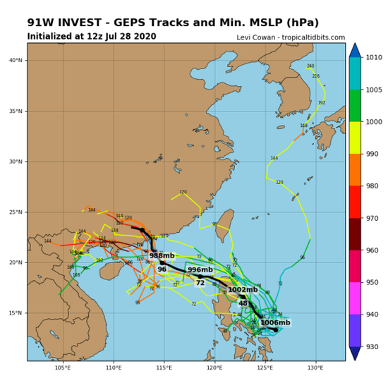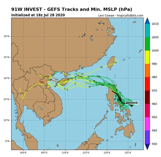 ECMWF(欧洲中心数值预报)方面,对台风胚胎91W给出的路径预报同样表示,未来台风胚胎91W将进入南海,且影响我国华南地区。