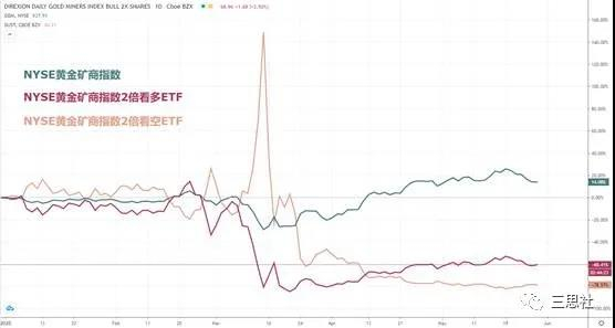 例如,NYSE黄金矿商指数今年累积上涨了14%,但3、4月份金价大幅波动,导致其2倍看多和看空ETF今年累积跌幅均在60%以上(下图)。