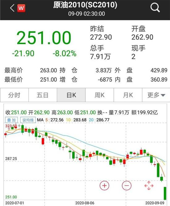 国内期市方面,截至8日夜盘收盘,受国际油价拖累,原油期货主力合约(原油2010)收于跌停板,跌幅为8%,报251元/桶。
