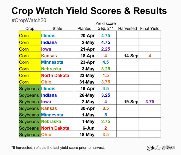 堪萨斯州的玉米产量和预期的一样只有4个,尽管几乎没有变化,因为在生长季节,作物可能承受了比生产者想象的更多的压力。这是目前三款农作物观察表中最好的结果。2018年,堪萨斯州的玉米产量在遭遇干旱后跌至1,去年由于开始时天气非常潮湿而跌至3。