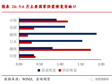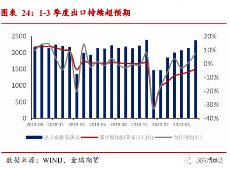 由于欧美制造业开始强劲复苏,供需缺口趋于缓和,预计未来替代效应将逐步消退。 疫情以来由于经济封锁措施等因素各国的经济修复表现出一定的不均衡性,经济复苏的初期5-6月主要经济体中美国、德国、日本消费端的需求显著强于供给端修复,产生了较大的供需缺口。同时由于中国早一步走出疫情冲击,生产端修复强于消费端,获得较大出口需求,中国在全球的出口占比有所提升,是支撑出口二季度超预期的重要原因。但自6月以来,美国制造业修复趋势优于服务业,欧洲经济全面修复,制造业恢复较好,供需缺口开始修复甚至未来有反转的可能,替代效应预计对下半年出口支撑力度减弱。