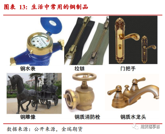 在研究中我们发现由于铜制品过于常见,所以一些实际出口量非常大的铜制品很容易被忽视。铜因其很好的质感以及杀菌特性被广泛的运用在丰富多样的产品中。常见的铜制品包括:服装上的装饰品及拉链、洁具中的铜制水龙头、厨具中的铜锅和铜餐具等。另外生活中的金银餐具及摆件中也常添加铜以改善光泽、亮度以及硬度,通常银质餐具中会添加7.5%的铜。由于黄铜的机械性能和耐磨性能都十分优秀,铜制品中使用的大多为含铜量65%左右的黄铜。雕塑中的用铜一般也是黄铜,但有时候为了艺术追求也会使用青铜和白铜,我们主要使用黄铜材质作为估算的基础。