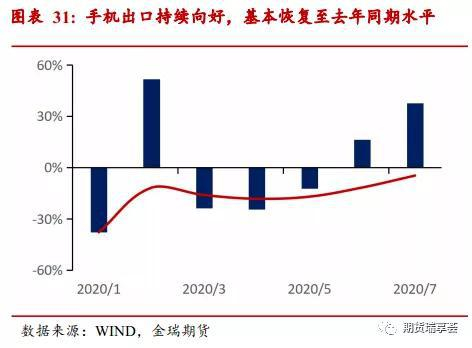 2020年5月以来疫情对全球经济活动冲击边际放缓,美国、欧元区PMI分别自6月、7月重回景气区间,经济修复持续超预期,摩根全球7月制造业PMI50.3,回升2.4,带动出口回暖,从具体分项来看,防疫物资的贡献持续下降,电子产品、机电产品出口持续回暖拉动出口向上。我们认为出口最艰难的时期已经过去,预计仍将对下半年出口提供有效支撑。