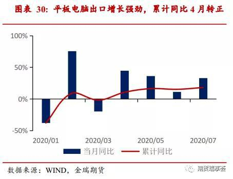 2020年1-7月平板电脑出口1.6亿台逆势同比增长18%,疫情仅对3月单月出口情况造成了冲击。而手机出口略不及平板电脑,1-7月出口4.9亿部,同比略降4.7%,6-7月开始修复强劲,单月同比增速可达37%。电子类铜消费出口整体修复态势良好。1-7月我们认为电子类需求强劲主要是疫情带来的社交隔离导致企业使用ZOOM等在线办公工具,学校采取在线授课等,让人们更依赖于电脑及手机的使用。预计在疫苗广泛使用、疫情彻底消除前,电子类出口仍将保持强势。手机出口有一定的季节性特点,7-8月往往是旺季,四季度可能有所回落。电子产品四季度出口增速预计在20%-25%。