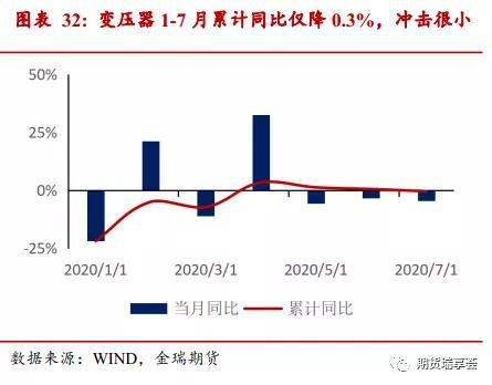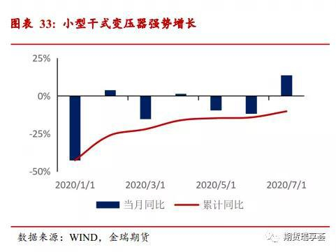 变压器出口受疫情影响不严重,小家电用小型干式变压器因小家电需求旺盛修复较快,单月同比已经转正。2020年1-7月变压器出口18亿美元,累计同比仅下降0.3%,疫情影响并不严重。 其中占比最高的小型干式变压器,7月单月同比增13.7%,修复态势强劲。小型干式变压器主要应用于大型、小型家用电器中,如:饮水机、电视、充电器等。