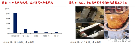 电力电气零部件出口耗铜量约118万吨,传统分析中我们往往只关注其中的电线电缆、电机等部分,2019年分别耗铜约84万吨、10万吨,占电力电气零部件耗铜量的80%。剩下的一方面是用在插座、开关以及连接器等零部件,耗铜量分别在3-6万吨左右,量级不大。另外主要是用在各类变压器上。在此次研究中我们主要参考拆废回收站、客户调研,国标、招标技术参数等文件及铜协相关资料重点分拆了变压器的耗铜量。