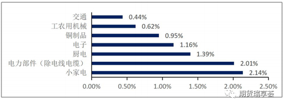 约占内消9%的铜消费出口易被忽视,主要包括小家电,厨电、消费电子产品、工农用机械、交通及铜制品。提到铜消费品出口,市场关注的往往是电线电缆、大家电和电机三大主要用铜终端产品的出口。根据海关数据,2019年这3大领域用铜量约为142万吨,占铜消费总量12%。实际,大家忽视的小家电、除电线电缆外的电力电气部件、厨电、工农用机械、及铜制品等出口数量巨大,用铜量也不可忽视。以上7类出口的铜消费量约104万吨占国内总消费量的9%。