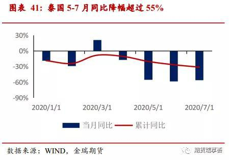 2020年1-7月累计出口铜材43.7万吨,累计同比降16%。3月单月曾同比增19.63%,但之后修复未能持续。5-7月单月同比都在下降幅度都在30%以上,尚未见到修复的迹象。主要由于主要出口国家中的东南亚国家下降幅度较大,单月同比降幅甚至有扩大的迹象。如其中泰国5-7月单月同比降幅在55%以上,越南7月单月降幅在30%以上。其他发达国家如韩国等铜材的出口最差的时期似乎已经过去,开始出现边际修复。未来随着疫情影响逐渐褪去,经济开始修复,预计东南亚的出口也可能出现好转。