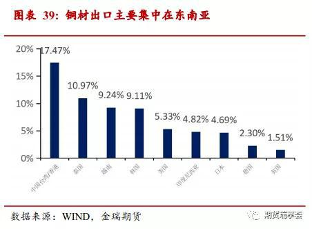 占出口铜消费中比例最高的铜材出口由于主要出口地经济修复不理想等原因目前尚未看到修复的迹象。我国主要的铜材、铜合金出口目的地是在亚洲,根据2019年的海关数据除中国台湾和香港外,出口最多的是泰国、越南和印尼等东南亚国家,出口比例占铜材总出口金额超过25%,14%的铜材出口到日韩,10%的铜材出口至美国和欧盟国家。主要铜材出口地东南亚经济基础比较薄弱,越南、印尼的疫情情况仍较严重,经济修复不理想。