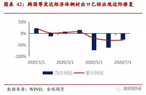 汽车属于单品价值较高的耐用品,在受到疫情冲击后,收入不确定性上升,人们的需求快速回落,另一方面欧美等发达国家的汽车需求近几年本身就持续回落,两因素叠加,预计四季度难有起色。汽车2020年1-7月累计出口44.8万辆,累计同比降21.2%。从单月同比来看, 5月是受到冲击最严重的时刻,自5月起单月同比逐月修复,但仍较此前水平下降明显,7月同比降23.1%。