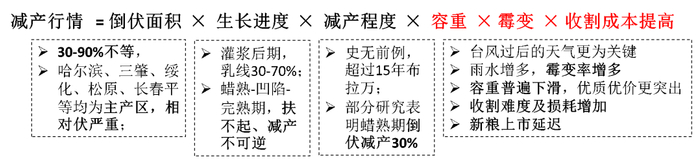 黑龙江面积下滑,其余省份维持稳定;黑龙江、吉林受台风影响粒重下滑明显,单产预估减幅-8%;辽宁西部干旱,单产预估减幅-3%;蒙东地区的通辽正常,但兴安盟及呼伦贝尔三旗市受旱情影响,减产严重;整体预估东北四省减产880万吨;华北稳产偏增,河南南部及安徽北部受前期洪涝灾害影响,产量略有下降,全国预计产量下滑910万吨。据天下粮仓预估,东三省预估减产1251万吨,与我们差异较大的是辽宁减产幅度。后续仍待上市后进一步验证。