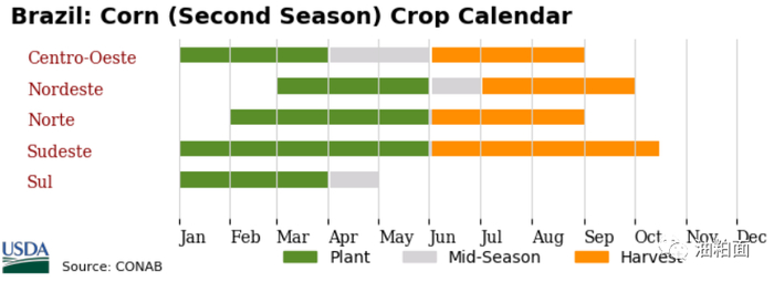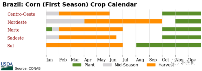 由于巴西地处热带气候区且作物具有长生长期,在巴西农作物生产周期比美国传统作物周期更为复杂。下面是巴西农作物生长季节中逐月的情况以及每个月可能出现的典型天气状况。