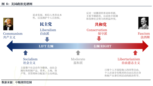 与之对应,一般情况下,共和党代表资产阶层和社会保守派,主要支持者有宗教组织、大企业、退伍军人、男性白人,在南部乡村力量最为强大;其政策上更重视外交,支持商业、削减福利、增加军队开支等,相对“鹰派”。共和党相对右倾。