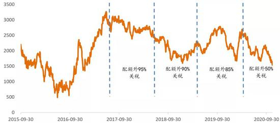 由上图可知,保障性措施在一定程度上支撑了国内食糖进口的利润空间,并且该曲线在三年配额外进口税逐步递减的过程中也呈现逐步向下趋近的走势,可见税对于国内食糖市场的重要性。
