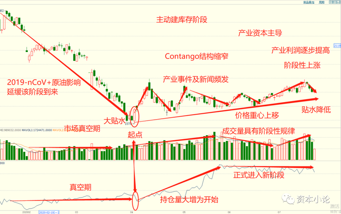 首先是通过【价格的下跌】来进入了真正的【主动去库存周期】,期间会有一段时间的【放量】且【价格企稳】,企稳后我们就会看到价格的震荡,成交量的下降;此时【升水】变小,并最终变成【贴水状态】。