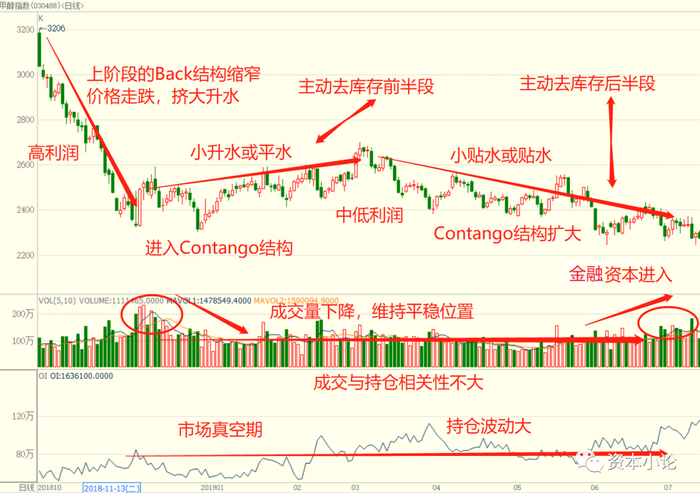 我们以2019年下半年甲醇的历史走势为例子。当时甲醇就被动去库存过程。同时也是很典型且中规中矩的去库存周期后半场,并且是有金融资本参与的。所以我们很直观的看到,每一次【商品价格】的走跌,都伴随着【持仓量】的上升以及【成交量】的上升;每一次【商品价格】的都高,都伴随着【减仓】的现象。此时的【产业利润】处于低水平,【期限结构】也是中规中矩的Contango结构、或者Contango结构再扩大;现货层面,也是维持【贴水】状态、或者【贴水】扩大。