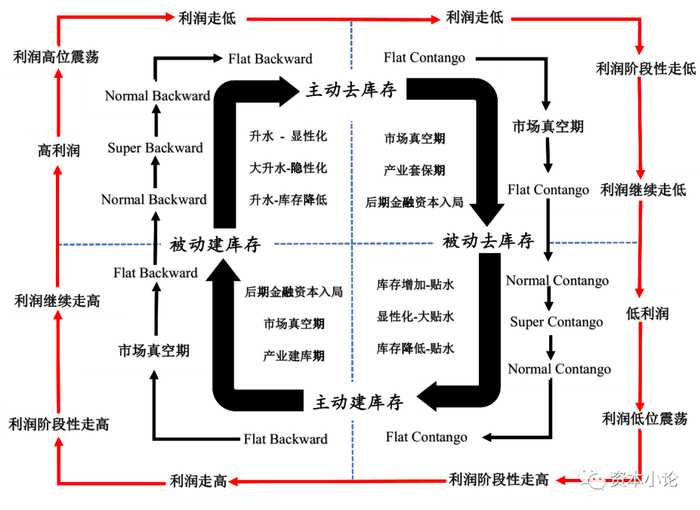 但是我们都清楚,高利润是不可持续的,所以隐形库存会慢慢显性化,并在产能的扩张下最终导致价格的回落,期间Backwardation结构会从Super Backwardation变成Normal Backwardation再进一步变成Flat Backwardation;现货由大升水,接着升水缩窄,并最终变成平水或者小贴水;期间【产业利润】逐步被蚕食。自此,当我们看到结构完全变成Contango的时候,被动建库存阶段结束。