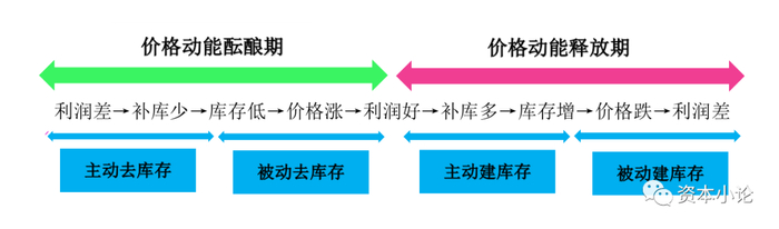 至此,库存完成了一个循环周期。从最初的主动去库存到被动去库存,随后的就是主动建库存以及被动建库存,并最终又回到了主动去库存。期间可以用下图来简单说明: