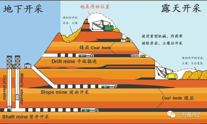 煤炭开采方法分为露天开采、地下开采两类。露天开采适用于距地表不足200英尺(约60米)的煤层,现代方法使用炸药和重型机械设备移除覆盖煤层的土壤、岩石,暴露出煤层后直接开采。煤层开采完毕后,需要填回以恢复土地。国外复垦成本一般高于国内。地下开采适用于埋藏较深的煤矿,一般深度在300英尺(约90米)以上,成本高于露天开采,生产安全风险也更高。介于200至300英尺(约60米至90米)的煤层可能会混合露天开采与地下开采两种方式。