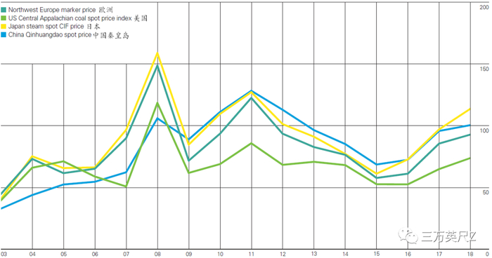 图表1:多年来中美日欧煤炭价格走势高度一致(美元/吨)