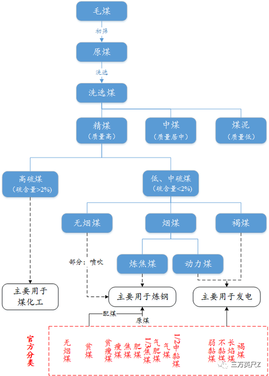 由于开采煤炭时常伴随着岩石、泥土等杂质,因此煤炭企业需要对开采的煤炭进行加工以去除杂质。企业从地上或地下直接开采出来、未经任何加工处理的煤叫作毛煤;毛煤经过简单选矸(矸石直径大于50毫米)、筛选分类后得到原煤;原煤经过物理化学方法、去灰去矸后得到洗选煤。按照煤炭质量从高到低,洗选煤分为精煤、中煤、煤泥,对应价格也呈现明显分层。煤炭企业披露的吨煤成本一般是原煤生产成本。