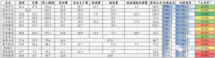 1)材料:分为原料及主要材料、辅助材料,主要指为开采煤层而挖掘坑道的费用,如建材、木材、支护用品、劳保用品等。2019年省级煤企中该项最高的为平煤神马,吨煤达52.2元;最低的为晋能集团,吨煤仅为15.7元;大部分企业在吨煤35元上下。