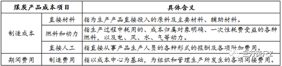 按照财政部的规定,煤炭产品成本应当由1)直接材料、2)燃料与动力、3)直接人工、4)制造费用四部分构成。我们一般把前三项统称为制造成本,第四项很多企业会纳入期间费用而非营业成本核算;四项之和称为完全成本。