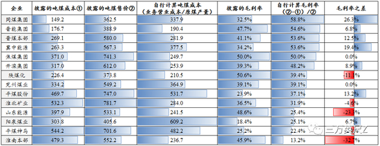 通过梳理2019年主要省级煤企(存量债>70亿元)在募集说明书中披露的吨煤成本与吨煤售价,我们可以自行计算一个类似于“毛利率”的指标,然后与企业披露的煤炭业务毛利率对比。