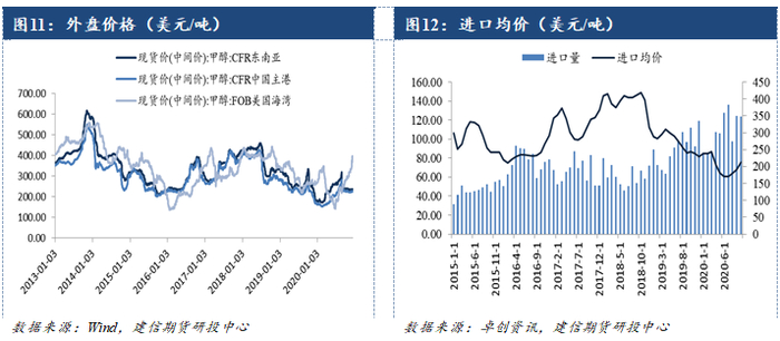 8月台风天气影响下,进口船只到港卸货时间延长,进口量回落至97万吨,随着天气因素的消散,进口量及再次回归至120万吨水平。2020年10月,甲醇月度进口量为123万吨,11-12月单月进口量预期也维持在百万吨附近。