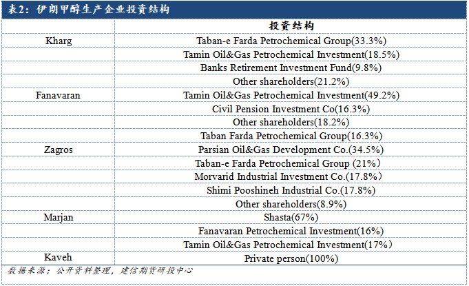 伊朗地区的石油化工企业以本国境内企业带头为主。伊朗国有企业主导了伊朗的油气及石油化工行业。下属企业是伊朗国家石油公司(NIOC)、伊朗国家天然气公司(NIGC)、国家炼油和销售公司(NIORDC),以及国家石化公司(NPC)。通过分析Kharg、Fanavarand等已投产甲醇工厂的投资结构,我们发现占据主导地位的Tamin Oil&Gas Petrochemical Investment、Taban-e Farda Petrochemical Group等公司均为伊朗本土投资公司。