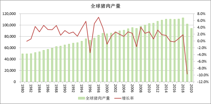 从猪肉产量的增长方面,1980年至2019年,全球猪肉产量由4942万吨增加到10197万吨,增量为5255万吨;同期,中国猪肉产量由1980年的1134万吨增加到了2017年的4255万吨,增量为3121万吨,中国猪肉产量的增量占到了全球猪肉产量增量的59%。中国猪肉产量的变化在很大程度上决定了全球猪肉产量的变化。