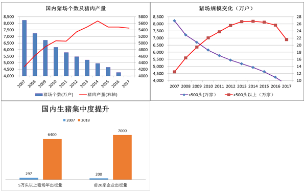 随着我国对肉类需求量的持续性增加以及环保要求的趋严,生猪养殖迅速向规模化发展。我国的猪场个数特别是小型猪场的个数迅速减少,同时万头以上的猪场数量持续增多。自2007年到2017年的11年间,我国猪场的总个数由8235万户下降至3775万户,其中下降的主力为50头以下的小型猪场,50-500头规模的猪场数量变化不大,500头以上的规模猪场的数量增加较快。500头以上的规模猪场的个数由2007年的12.5万户增加到了2017年的21.5万户;其中1-5万头的规模猪场数量由1803户增加到了4134户,5万头以上的规模猪场的数量由50户增加到了407户。另外,从我国5万头以上猪场的年出栏量以及前20家企业的出栏量在2007年和2018年的数据对比也可以看出,我国生猪规模化养殖发展迅速。尤其是2018年开始的非洲猪瘟加速了散户退出市场以及大企业加速扩张,规模化养殖企业份额有了显著的提高。