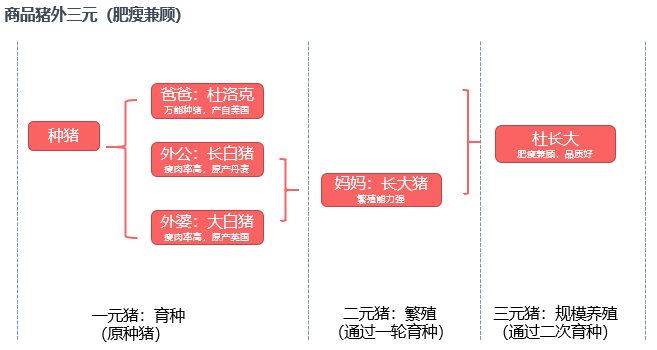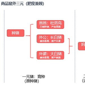 所谓外三元猪,即由三个不同的品种杂交而来,而且祖代全部来自国外。一元猪中的长白猪和大白猪可以互为父系和母系,它们的最大优点是瘦肉率高,且其后代长大猪具有较强的繁殖能力;种猪杜洛克,被称为万能种猪,是全球应用最为广泛的种猪,其主要优势为增重快,饲料报酬高,瘦肉率高以及抗逆性比较强等。