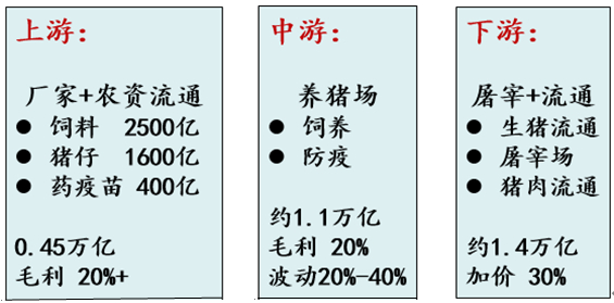 2019年,我国生猪出栏量为5.44亿头,按照30元每公斤,出栏均重110公斤计算,当年我国生猪总产值1.8万亿。生猪的产业链可以分为上游、中游和下游,上游主要包括饲料、猪仔以及疫苗,产值大约0.45万亿;中游主要为养猪场的饲养成本以及防疫成本,产值约为1.1万亿;下游主要为屠宰和流通环节,总产值约为1.4万亿。