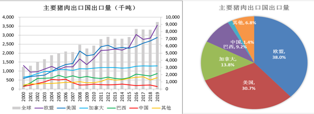 从主要猪肉出口国方面看,猪肉的主要出口国相对比较集中,其中欧盟出口量占比38%,美国占比30.7%,其他主要出口国分别为加拿大、巴西以及中国,这5个国家的出口量占全球总出口量的93.2%。分国别来看,从2000年到2019年的这段时间中,全球猪肉出口量由308万吨增加到了934万吨,这其中的增量的主要贡献国为美国以及欧盟。欧盟的主要出口量由131万吨增加到了355万吨,美国的出口量由58万吨增加到了287万吨,其余国家的猪肉出口量在这段时间中保持相对稳定。