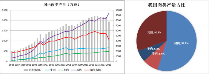 我国的肉类产量自1985年至今已经有了很大程度的增长,1985年我国肉类总产量仅有1927万吨,到了2019年,我国的肉类总产量已经增加到了7759万吨,总的增长幅度为403%,年均增长率为4.06%。其中,猪肉产量由1985年的1655万吨增加到了4255万吨,年均增长率为2.74%;牛肉产量由47万吨增加到了667万吨,年均增长率为7.89%;羊肉产量由59万吨增加到了488万吨,年均增长率为6.2%;其他肉类包括水产以及家禽肉产量由166万吨增加到了2349万吨,年均增长率为7.87%。从近几年的情况来看,2014-2019年我国的肉类总产量持续下降,这几年的产量由8707万吨下降到了7759万吨,其主要原因是猪肉产量的持续下行,尤其是2018年非洲猪瘟肆虐之后,我国的猪肉产量由2014年的5671万吨下降到了2019年的4255万吨,下降幅度为1416万吨;牛肉和羊肉的产量持续处于稳定增加中,且其增加幅度远高于猪肉,一定程度上反映了我国居民的消费升级情况。并且在非洲猪瘟后,水产、家禽肉产量迅速增加,弥补了猪肉短缺造成的肉类产量缺口。