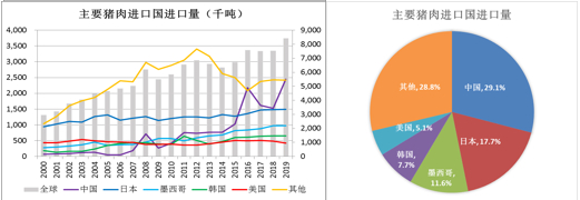 从主要猪肉进口国方面看,猪肉进口国相对比较分散,最大的几个进口国分别为中国、日本、墨西哥、韩国以及美国,其中除了中国在近几年进口量由比较大的增加外,其余几国的进口量自2000年以来一直保持相对稳定。