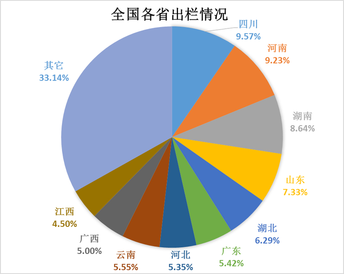 我国生猪生产主要集中在四川、河南、湖南、山东、湖北、广东、河北、云南、广西、江西等10个省份,这10个省份的生猪出栏量占全国总出栏量的66.86%,而且其占比还在继续增加的过程中。