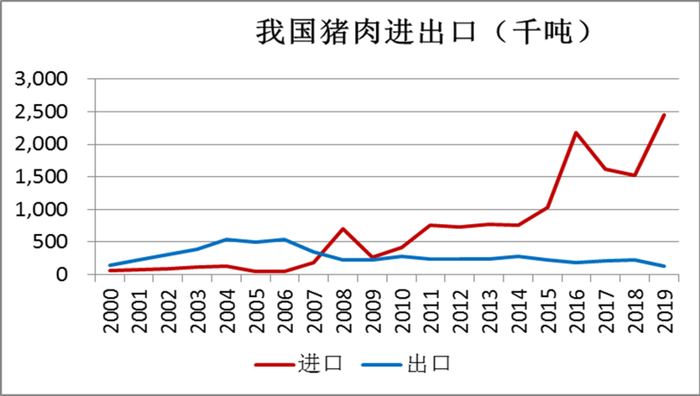 2000年以来,全球猪肉的贸易量保持上升趋势,但是贸易量在产量中占比仍然处于相对较低的水平。2000年,全球猪肉的贸易量为308万吨,当年猪肉产量为8476万吨,贸易量占总产量的比例为3.63%;截至2019年,全球猪肉的贸易量为940万吨,当年猪肉产量为10197万吨,贸易量占总产量的比例为9.22%,贸易量在产量中的占比稳步提升。