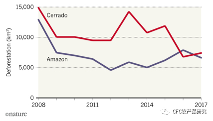 与此同时,被束缚的产能开始溢出到另一片肥沃的土地——与亚马逊雨林交接的塞拉多地区。作为南美洲第二大生物群落,和世界上生物最为多样性的热带草原,塞拉多地区成为了大豆种植的新宠。