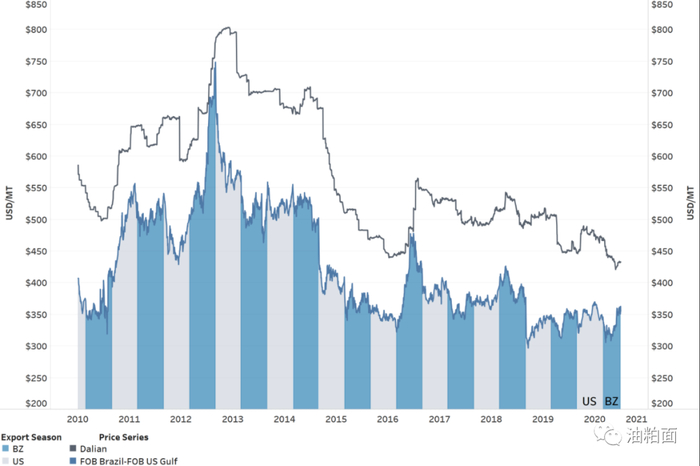 3这个价格序列是组合了美国大豆离岸价和巴西大豆离岸价而形成的,取值随着处于出口季的国家变化而变化。3月至8月(巴西出口季)的价格为巴西的价格,9月至次年2月(美国出口季)的价格为美国的价格。