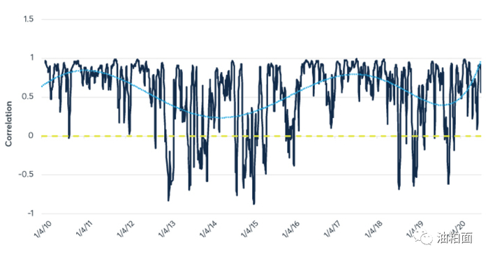 图2. 20天移动相关性(相关水平),巴西大豆离岸价与CBOT大豆期货: