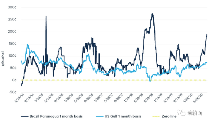 上方的图3显示了两个现货市场的基差:巴拉那瓜港口大豆现货价格减去近月的CBOT大豆期货,美湾现货价格减去近月的CBOT大豆期货。从图中可以明显看出,相对于美湾地区,巴西基差的波动更大。