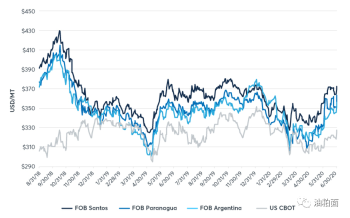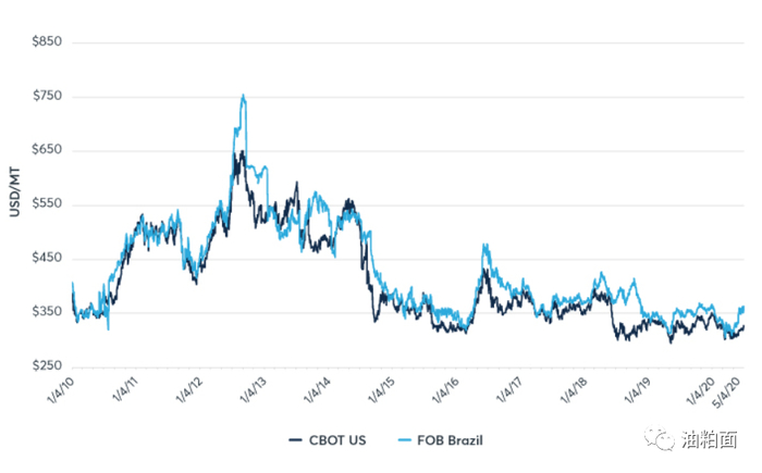 1南美大豆期货合约的价格基于普氏资讯对桑托斯港口出口价格的评估。但是,普氏资讯仅在2018年才开始发布此评估,更详细的分析还需更长期数据分析支持。巴拉那瓜的出口价格与普氏桑托斯评估价格高度相关(相关性为94%),因此它在许多计算被用作的后者的近似值。