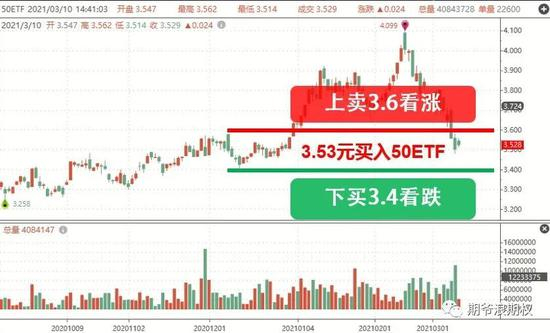 举个例子(下图),假设我今天以3.53的价格买入1万股50ETF,同时卖出1张3月3.6的看涨期权,又买入一张3月3.4的看跌期权,这样就组成了一个领口策略。